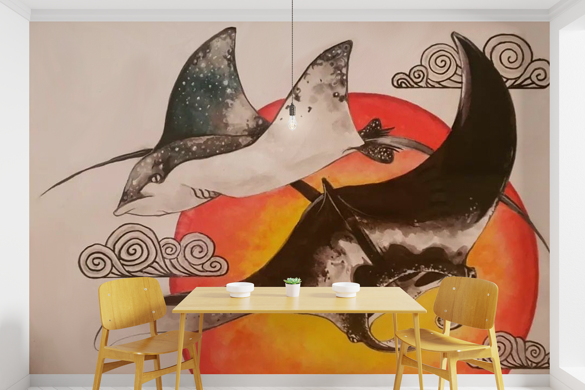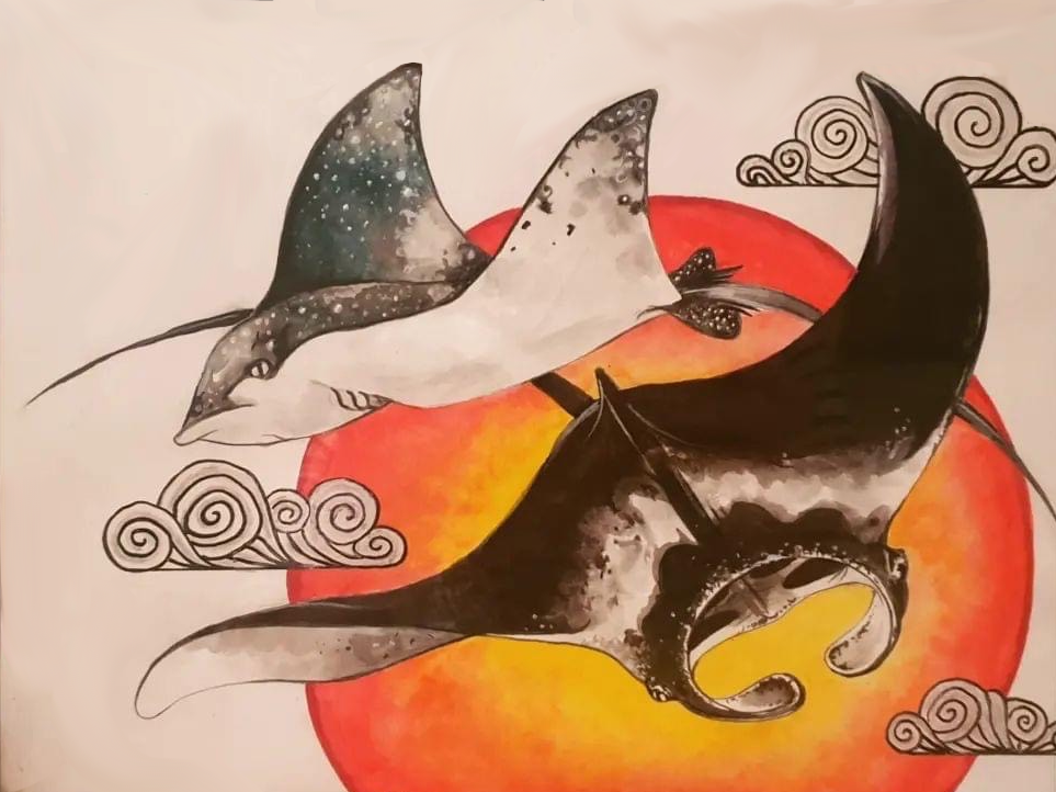 Mixed media sea creatures illustration for an 8 year old manta and Japan enthusiast.